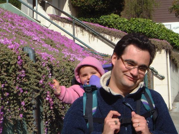Guillaume, and Laurenn next to purple flowers