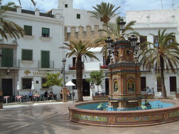 A colorful plaza at Medina Sidonia (city wall in the background)