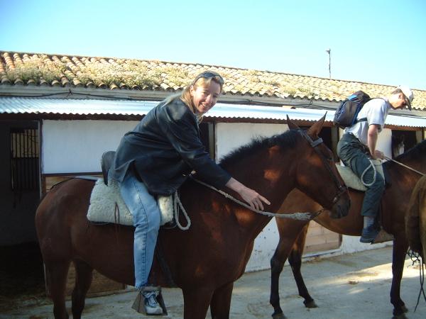Kelly saddles up for the all day ride to the "Cueva de la Pileta"