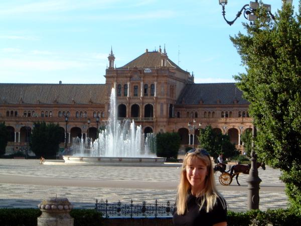 Seville - Kelly and the fountain in the amazing Plaza de Espana