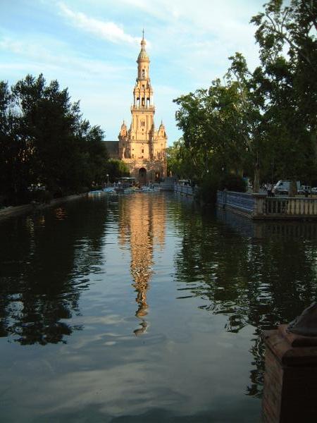 Seville - A tower of the Plaza de Espana reflecting in the lake