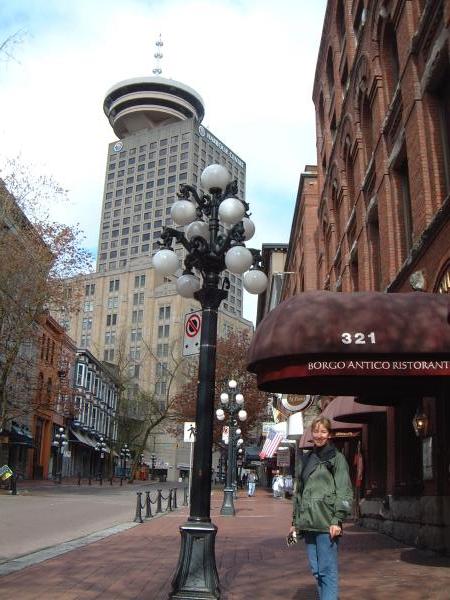 Kelly on the sidewalk; sky-scrapers in the background